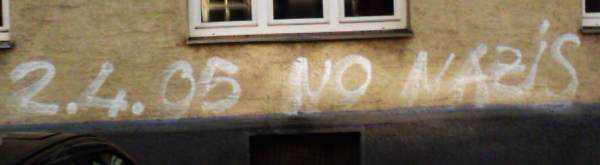 diese vorgehen wollten!" Was noch geschehen könnteNatürlich ist auch wieder der kreative Geist gefragt, um den Nazis ihren Aufmarsch so richtig zu vermiesen. Auch im Vorfeld läßt sich schon viel Lustiges unternehmen. Hier ein paar Vorschläge: #1: Sophie Scholl - Der FilmZur Zeit zeigen viele Kinos den Film "Sophie Scholl". Danach könnten mensch gut Aufrufe gegen die Nazidemo an die BresucherInnen verteilen, Plakate im Kino und Umgebung aufhängen oder bei den KinobetreiberInnen Aufrufe und Plakate hinterlegen und bitten, diese weiterzugeben. #2: Stammkneipe um die Ecke, etc.Bringt Aufrufe und Plakate in eure Stammkneipen. Fragt den Friseur um die Ecke, ob er nicht ein Plakat ins Schaufenster hängt. Bittet den Gemüsehändler, zum Obst seinen KundInnen einen Aufruf mitzugeben. #3: SchulenNoch eine Woche bis zu den Osterferien! Jetzt ist noch Zeit, eure Mitschülerinnen und Mitschüler anzusprechen. Bittet eure LehrerInnen, etwas zu den Naziumtrieben zu sagen. Malt im Kunstunterricht Transparente, verabredet euch für den 2. April und kommt zahlreich! #4: Transparente für die NazirouteWohnt ihr an der Naziroute? Hängt ein Transparent raus, daß den Nazis klar zeigt, dass sie nicht willkommen sind. Sprecht eure NachbarInnen an. Ihr wohnt nicht an der Naziroute? Malt Transparente und gebt sie Leuten, die an der Route wohnen. Wir vermitteln auch gerne. Meldet euch, wenn ihr Transparente habt oder braucht. #5: AnfahrtDie Nazis mobilisieren bundesweit. Am Tag der Demo werden wohl einige Nazis über die Nürnberger Autobahn oder Hauptbahnhof ankommen. Zeigt den Nazis, daß sie in München nichts verloren haben. #6: VirtuellesIhr hängt viel in Internetforen ab? Chattet gerne? Nehmt einen Link zu nazipleite089.tk in eure Signatur auf, schreibt ein paar Zeilen in Gästebücher, verlinkt unsere Seite. #7: VeröffentlichenNach der Nazidemo ist vor der Nazidemo. Auch wenn die Nazis am 2. April ein Desaster erleben werden, gibt es sie jedoch auch weiterhin. Mehr Texte, mehr Informationen, mehr Artikel gegen die rechte Gefahr. In SchülerInnenzeitung (übrigens: die Zensur von SchülerInnenzeitungen ist verboten worden), in Internetforen, in Magazinen, und auch bei indynews.net. #8: Join your local Antifa - Build your local AntifaOb "AK gegen Rechts" oder "Antifa Skateboard Rockers": Es gibt viele Möglichkeiten, sich den Nazis organisiert entgegenzustellen. #9: Sichtbar werdenAufnäher, Buttons, Klamotten, Transparente, Aufkleber. Nazis sind auch in der Stadt unterwegs, und je öfter sie sehen, dass sie nicht erwünscht sind, umso unwohler werden sie sich fühlen. Übrigens: All diese Sachen sind leicht herstellbar. T-shirt Farbe besorgen, eine Schablone schneiden, alte Pullis oder Hemden bei FreundInnen einsammeln, fertig. Buttonmaschinen gibt es auch in diversen Orten zum Ausleihen. Alle Macht der Phantasie. #9: SolifesteOrganisiert Solifeste gegen Rechts. Wir veröffentlichen auch gerne Termine hier. #10: noch mehr Ideen?Her damit....! #11: nicht wegschauen!Und wie immer gilt: Eingreifen statt Wegschauen! Wenn Nazis wieder Menschen durch die Stadt jagen, wenn Polizisten rassistische Ausweiskontrollen durchführen, wenn Menschen angepöbelt werden, wenn Kontrolleure Menschen ohne Geld für eine Fahrkarte wieder etwas "härter" anfassen. Zivilcourage statt Denunziantentum! |