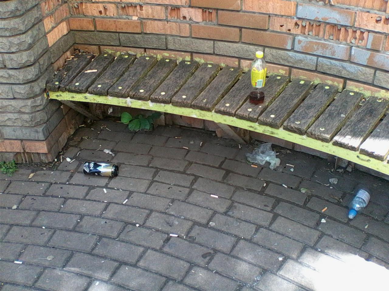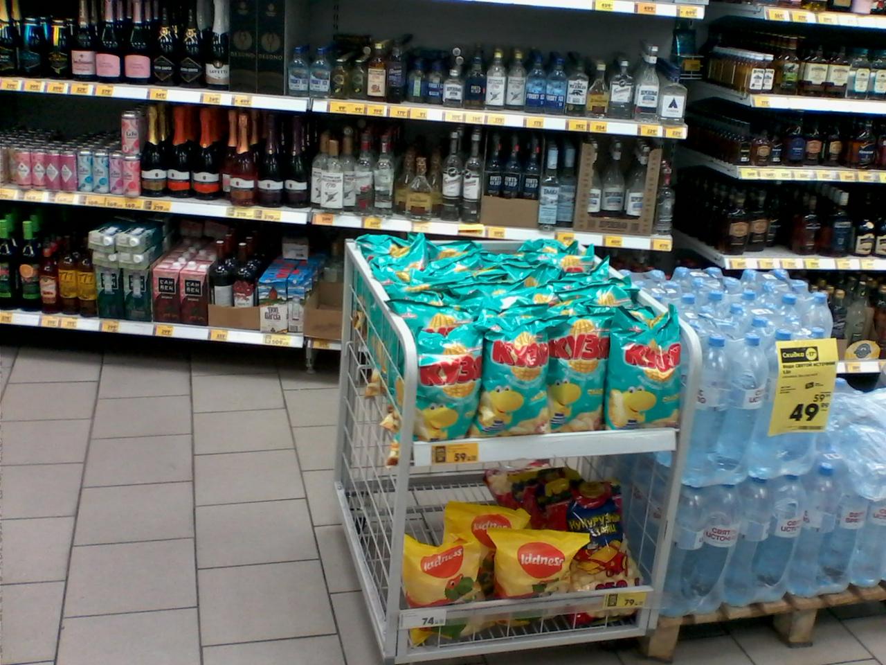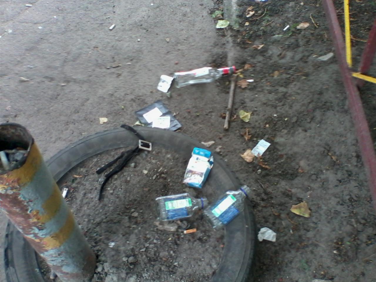 В магазине соседствуют полка спиртного и детские сладости, вероятно, для постепенного приобщения детей к пойлу. Результат не заставил ждать себя: на месте возлияния оставлены два стакана, две пачки от сигарет, упаковка от каких-то фруктовых сладостей. Фотография сделана возле средней школы (не буду уточнять номер).