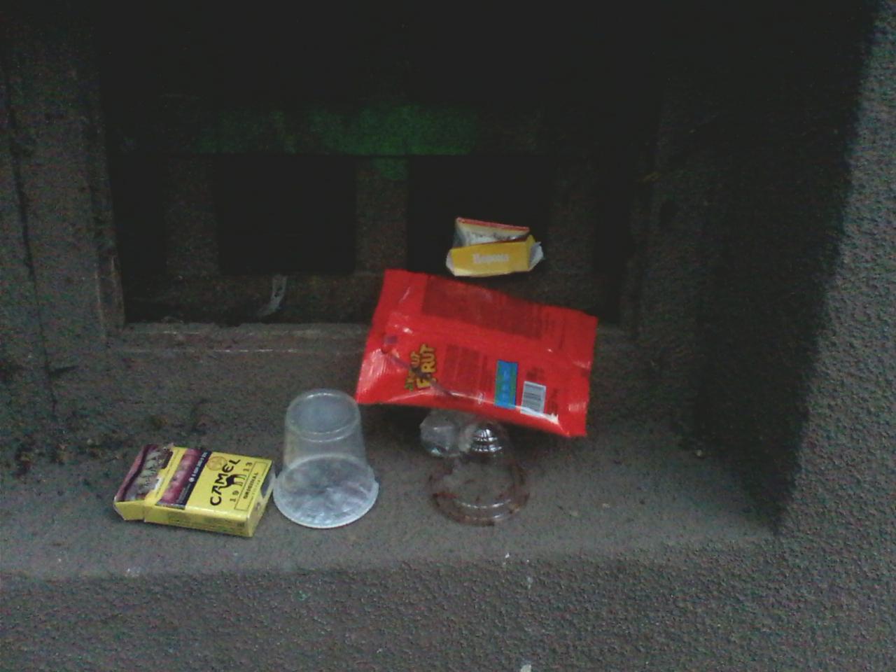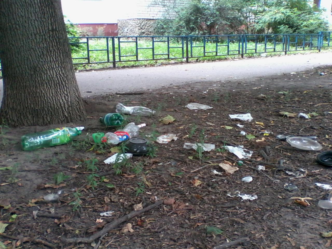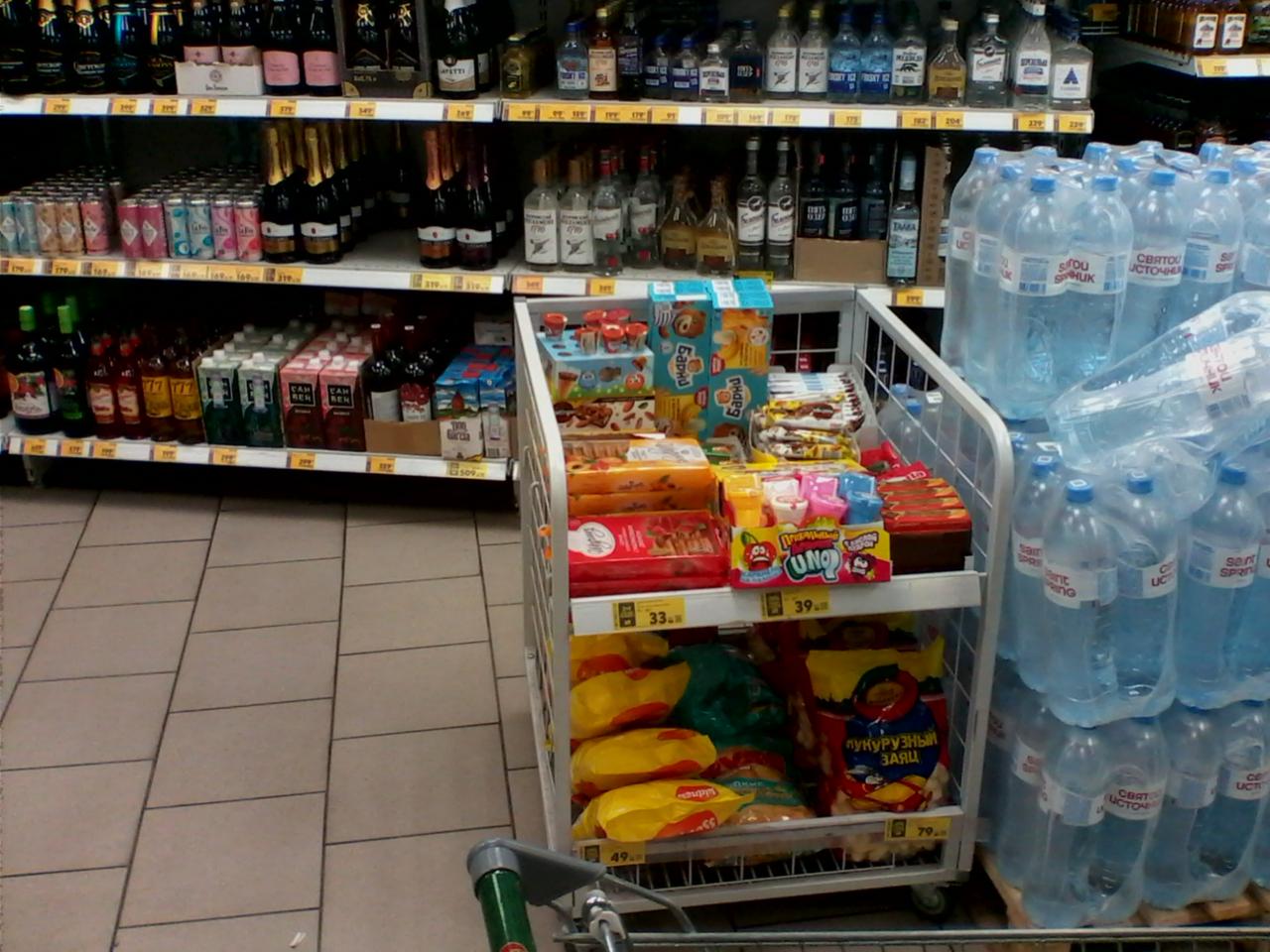 В магазине соседствуют полка спиртного и детские сладости, вероятно, для постепенного приобщения детей к пойлу. Результат не заставил ждать себя: на месте возлияния оставлены два стакана, две пачки от сигарет, упаковка от каких-то фруктовых сладостей. Фотография сделана возле средней школы (не буду уточнять номер).
